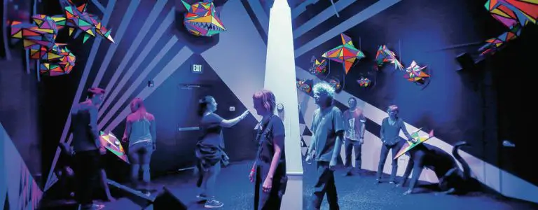Guests mingle inside a highly stylized event space illuminated by neon blue lights and abstract geometric art. Guests mingle inside a highly stylized event space illuminated by neon blue lights and abstract geometric art.