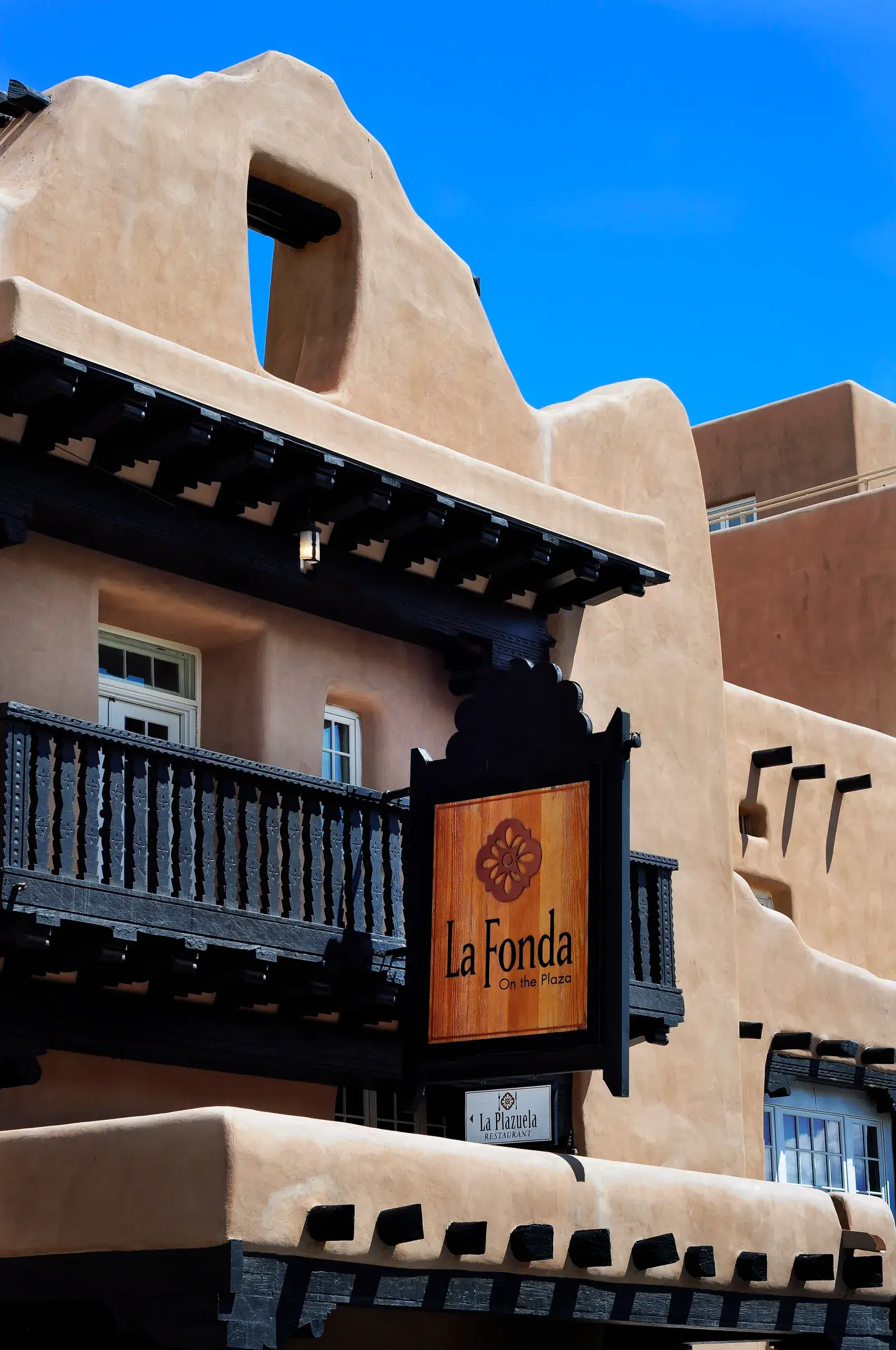 The adobe exterior of La Fonda On The Plaza features a dark wooden balcony and signage for La Plazuela Restaurant. The adobe exterior of La Fonda On The Plaza features a dark wooden balcony and signage for La Plazuela Restaurant.